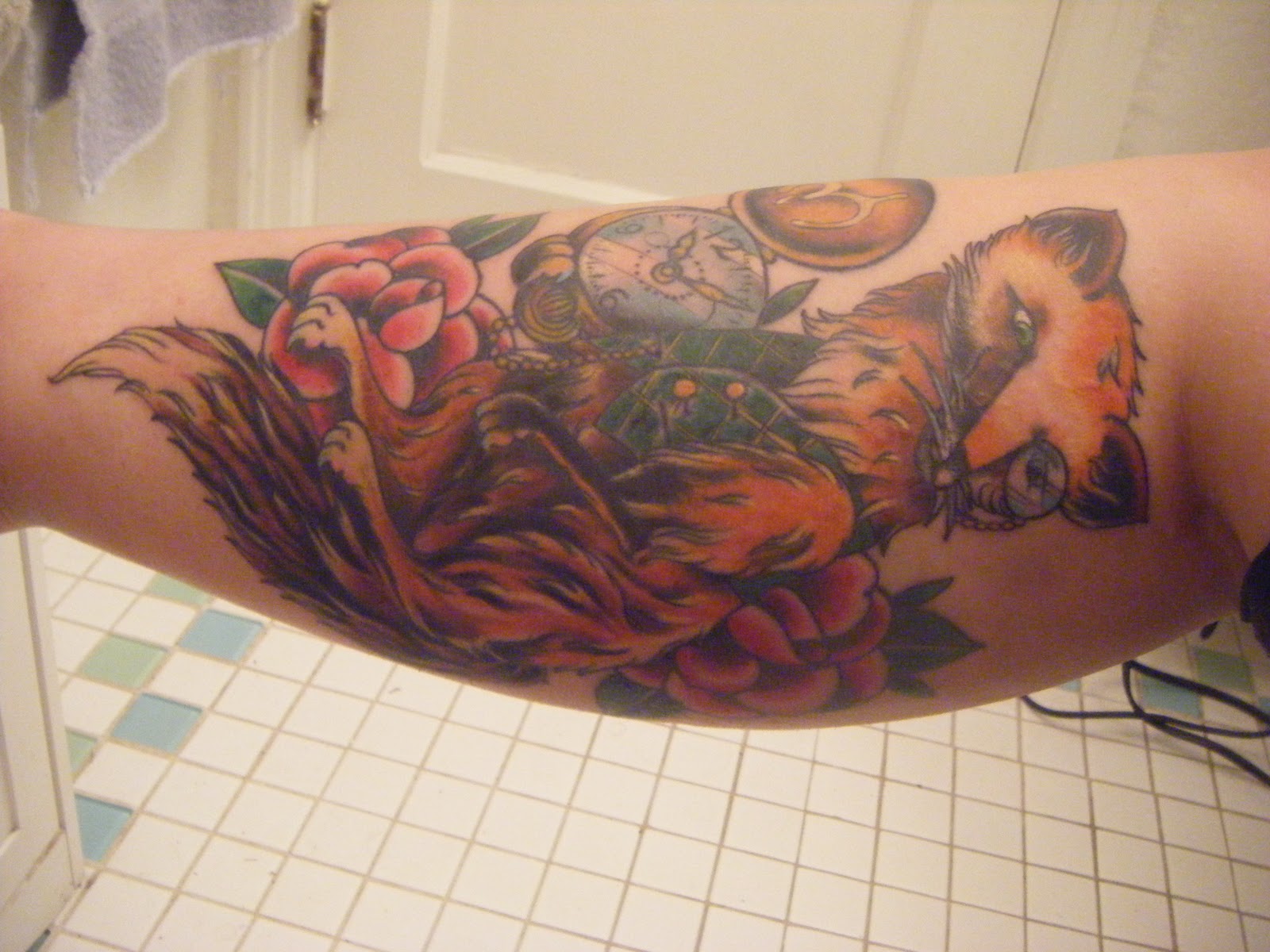 My cousin Jason has been coming to Denver once a year for the past few years so usually I just think up something for him to do on me- he did my thigh tattoo as well. I told him that I wanted a lady with roses and a compass, and he said he wanted to put a hat on her, and i said okay. Now people will stop me on the street to ask if it's Amelia Earhart. I've been asked probably approximately one million times if my tattoo is Amelia Earhart, so i've just started saying yes because if I saw my tattoo, I'd probably assume it was her as well. but to me my tattoo is a good luck charm for traveling. I want to see the world and this lady on my arm's gonna come with me!